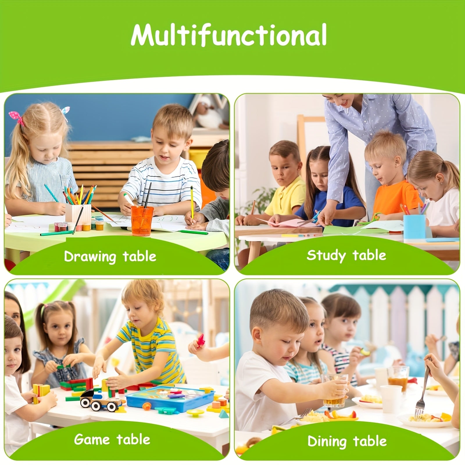 This versatile multi-purpose kids table and chair set is perfect for homework, meals, building blocks, art, and family time. The smooth, plastic tabletop resists ink and paint, making cleanup a breeze with just a quick wipe without leaving residue.