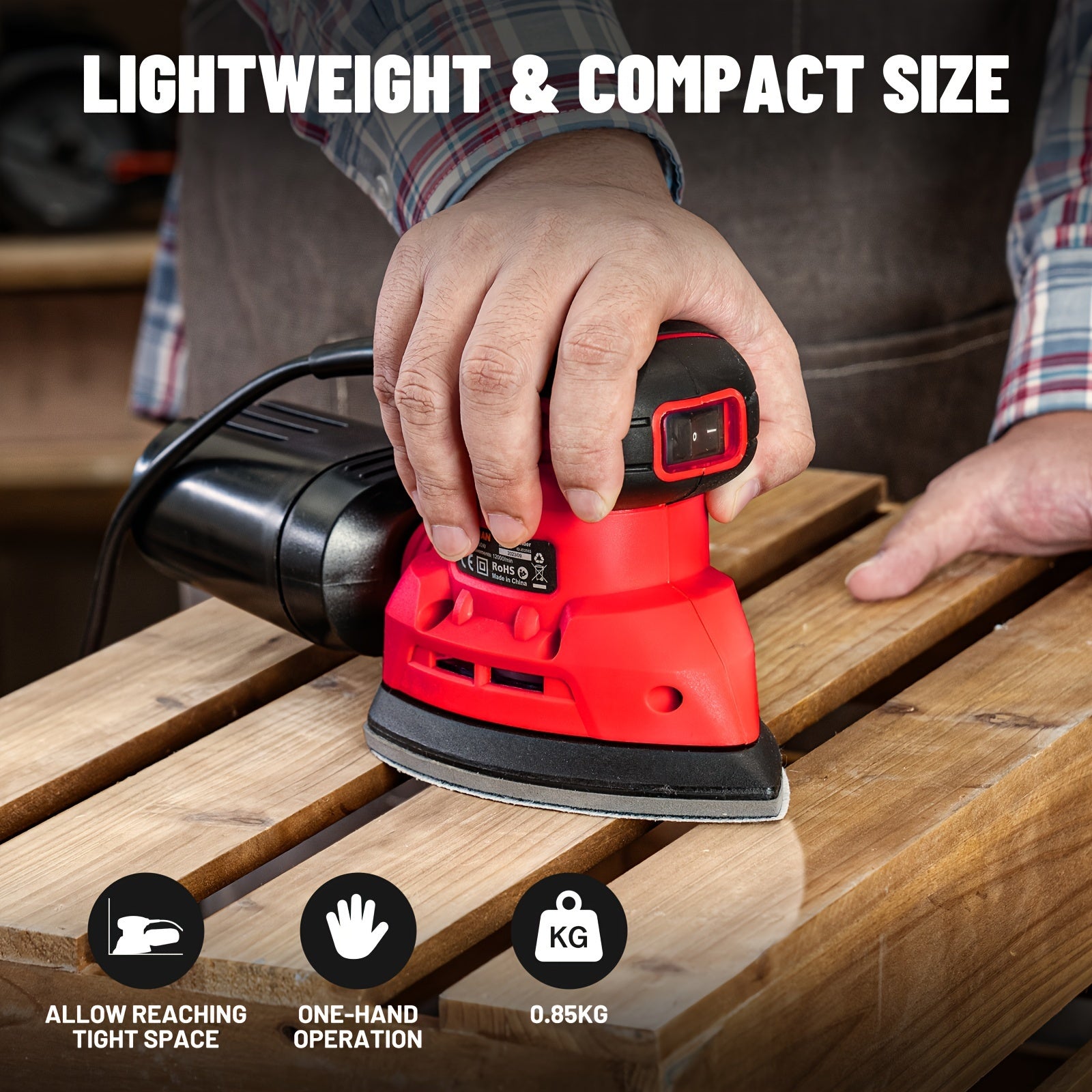 Lightweight for One-Handed Operation: Weighing just 1.87lb (0.85kg), this palm sander reduces hand fatigue during longer tasks and allows better maneuverability in tight or awkward spots.