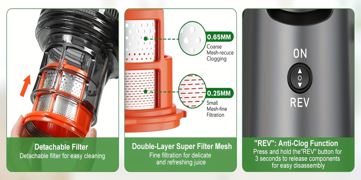 Suggestion: Once you're done, quickly press the "REV" (reverse) button to facilitate the easy disassembly of the juicer's upper components.