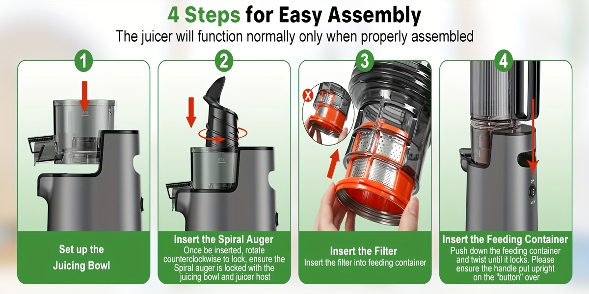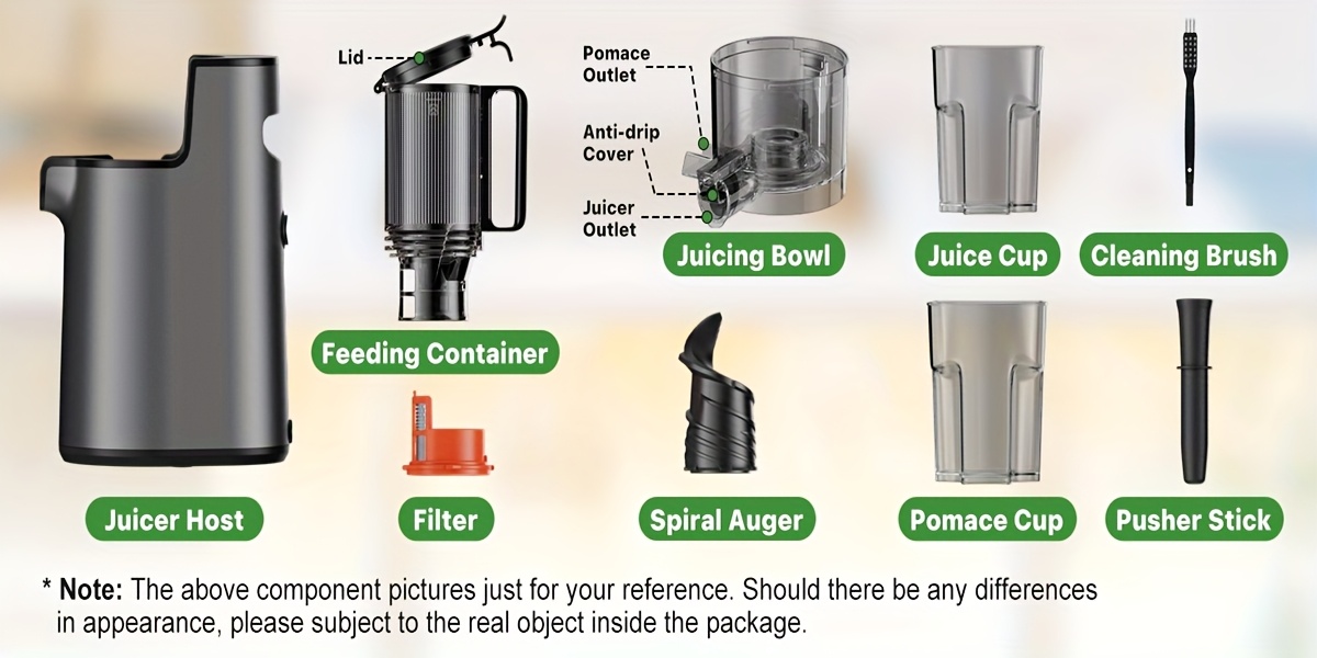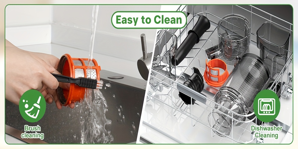 Our versatile cold press juicer offers a hassle-free cleaning process with its straightforward design, featuring just three key components and a unique cleaning tool that simplifies assembly, disassembly, and maintenance.