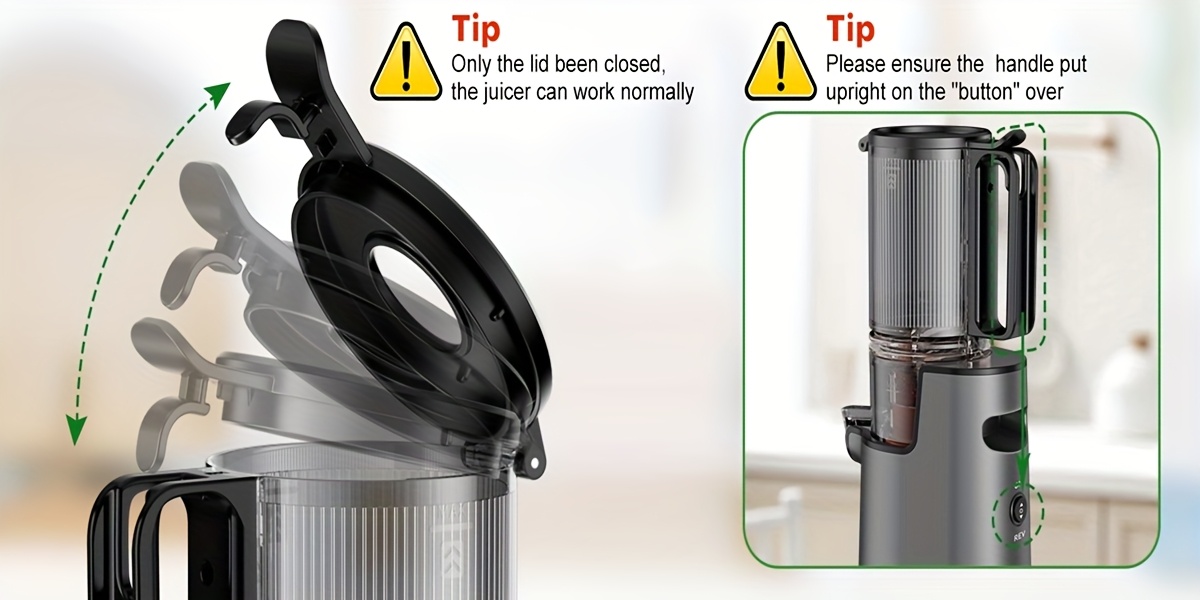 【Troubleshooting Manual】To guarantee the juicer functions correctly, please adhere to these troubleshooting steps: 1. When setting up the juicer, ensure that the handle is perfectly aligned with the power button. 2. Confirm that the lid is securely fastened. If the issue continues after these checks, please reach out to us for assistance!