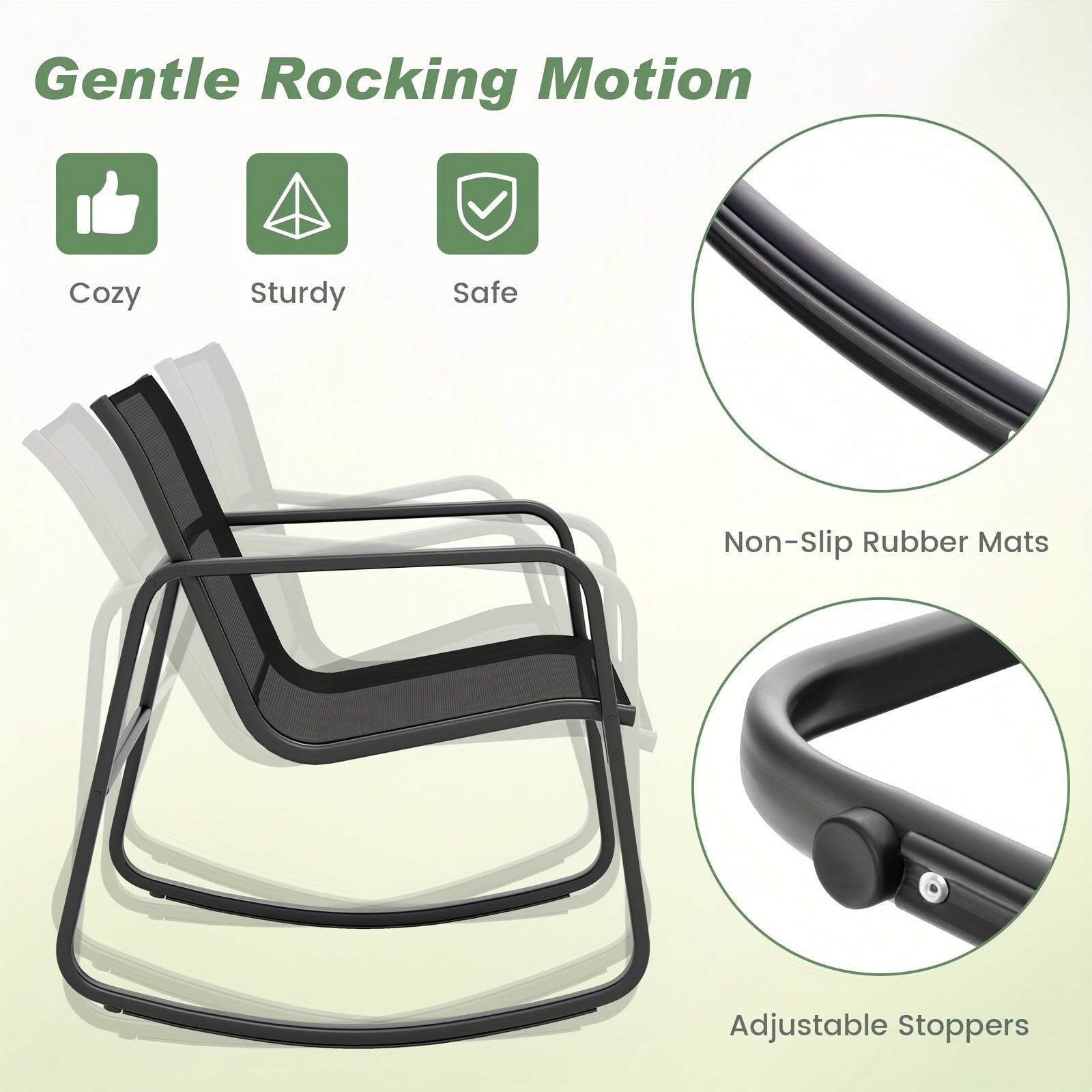 - Rocking comfort: curved seat/back, non-slip rubber mats, adjustable stoppers