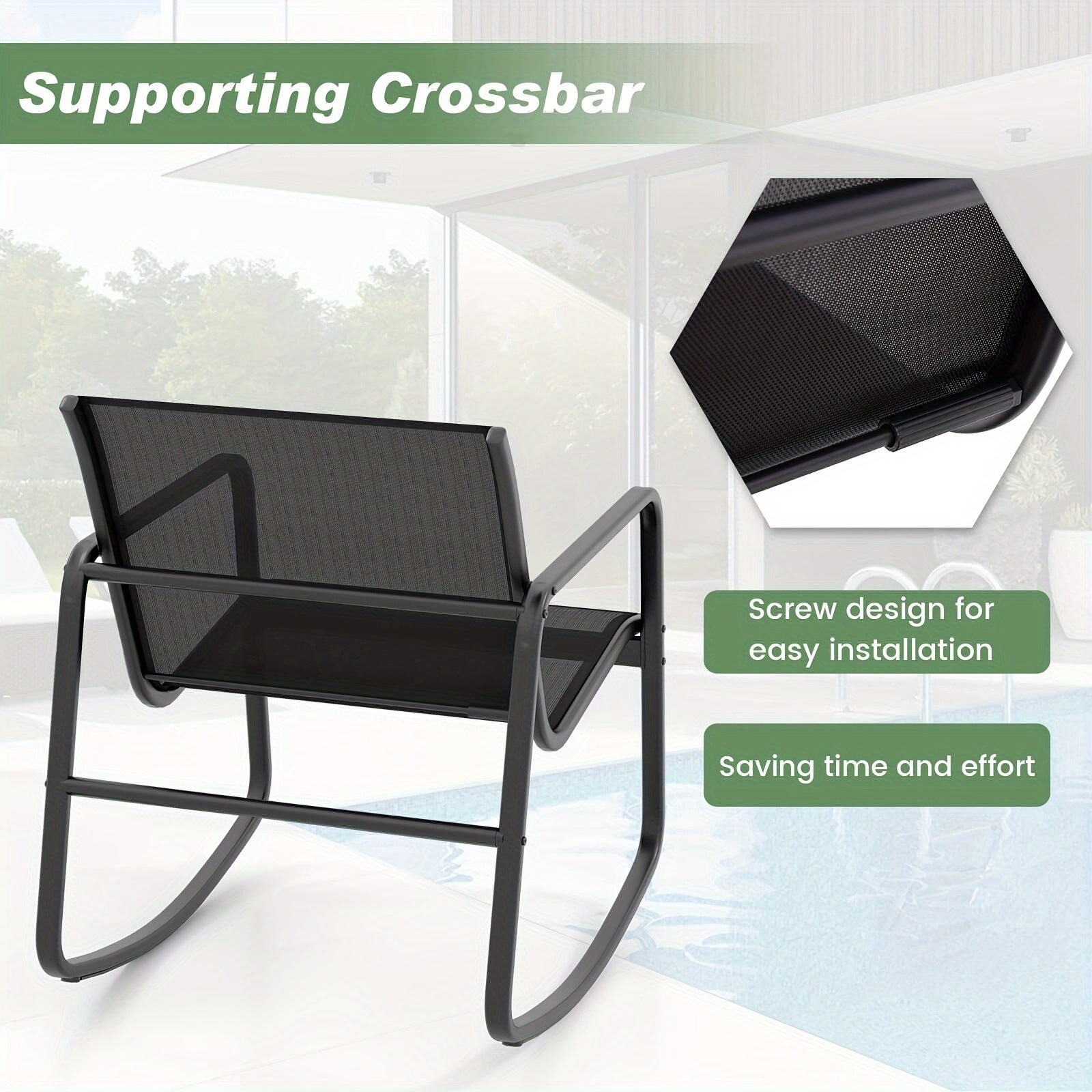 Two ergonomic rocking chairs feature curved seats and backs that cradle you in a relaxed posture, while a reinforced metal frame delivers dependable support. Each rocker sits on a stable base with non-slip rubber mats and adjustable stoppers so you can tailor the rocking motion to your space and preference. The breathable, quick-drying seat fabric stays comfortable in warm weather and dries rapidly after a spontaneous rain shower or a poolside splash.