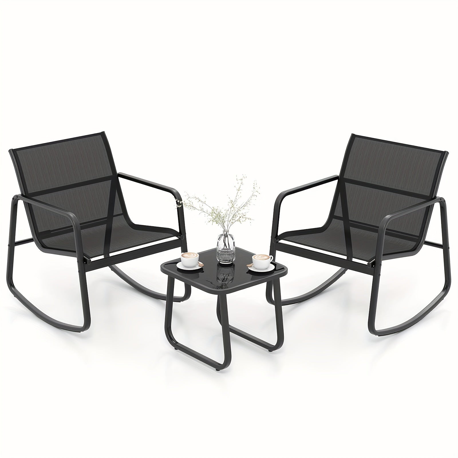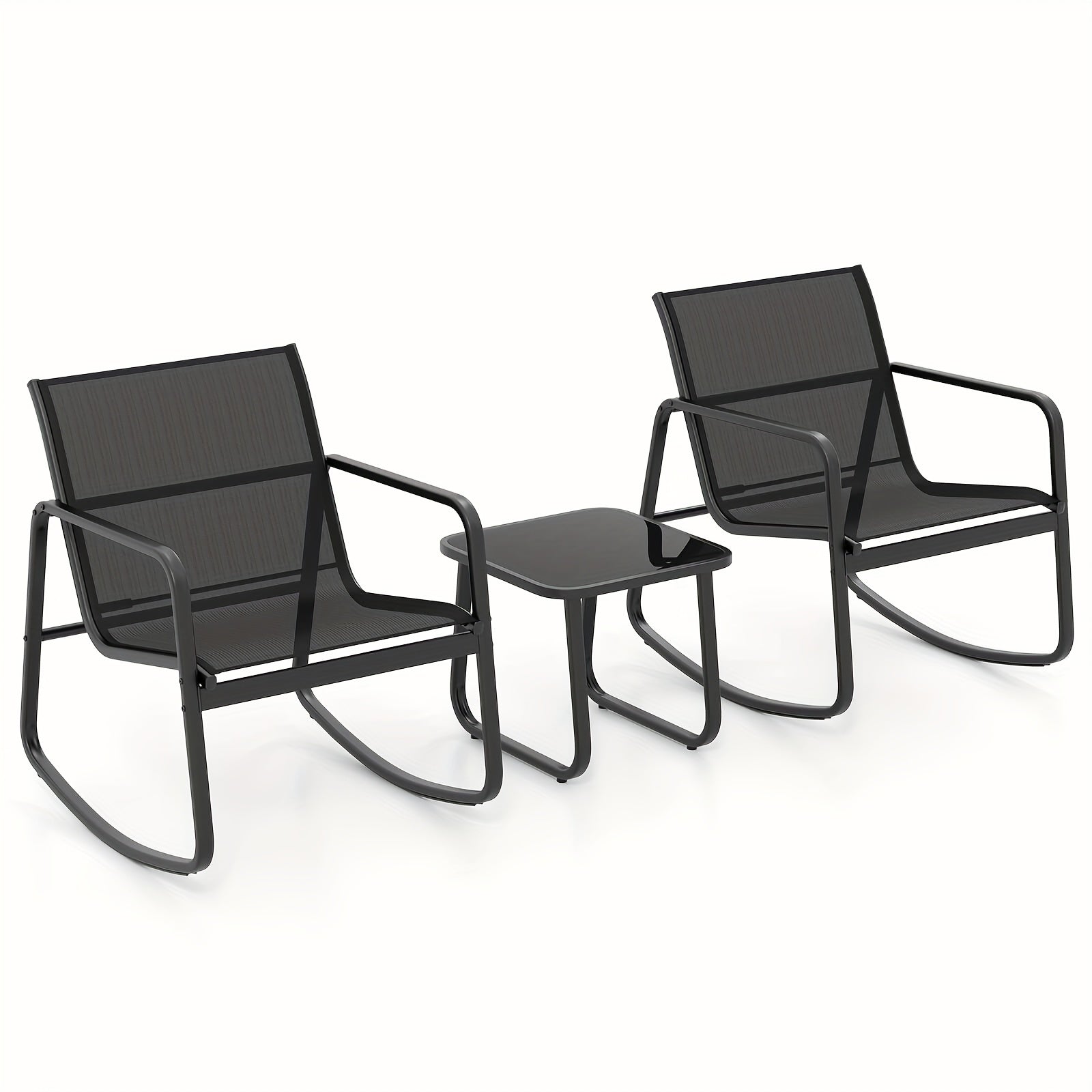 - Three-piece set: 2 rocking chairs + 1 tempered-glass coffee table