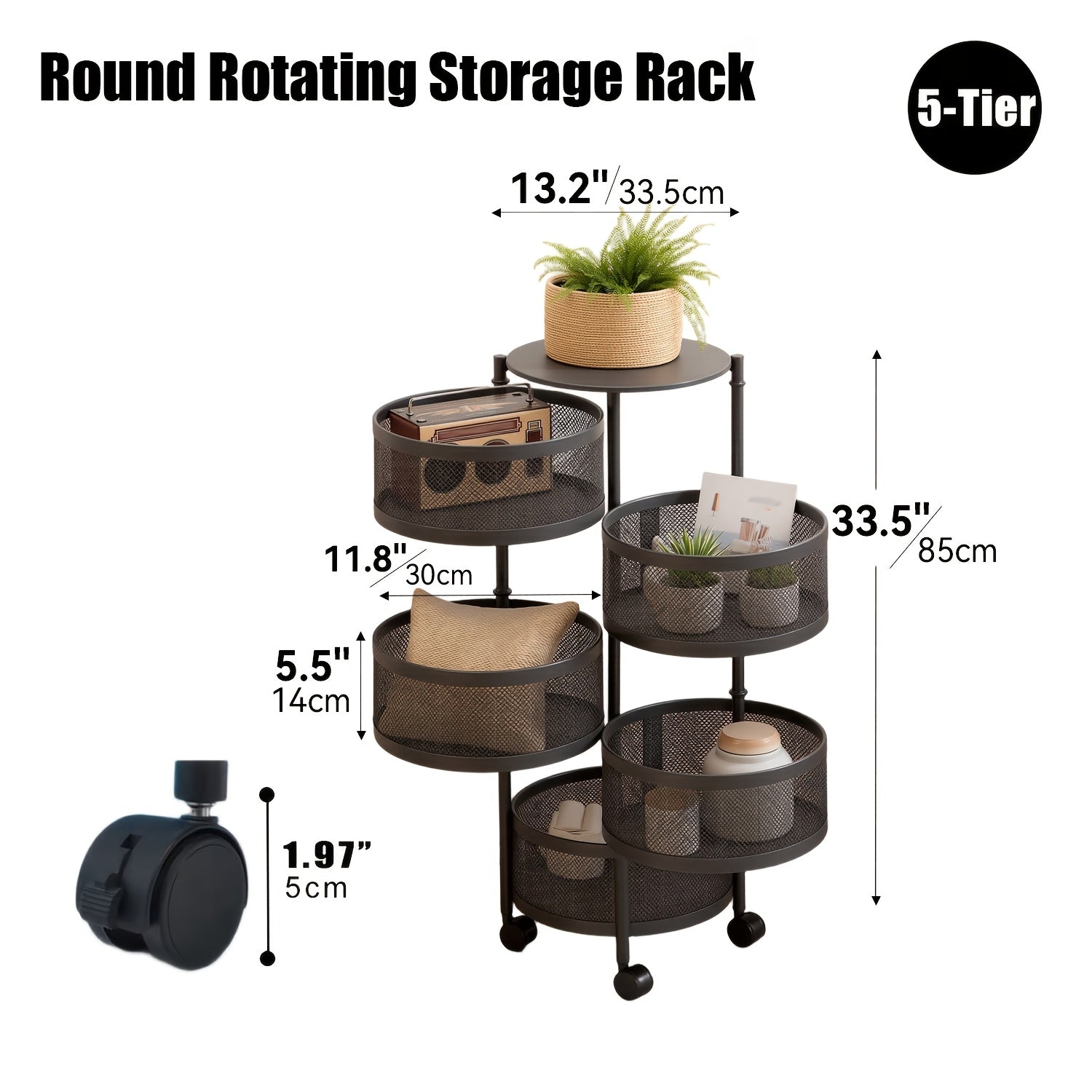 Care tips: Wipe with a soft, damp cloth to remove dust; avoid abrasive cleaners that could dull the finish. Periodically check that baskets rotate smoothly and that the unit remains level for safe, stable use.