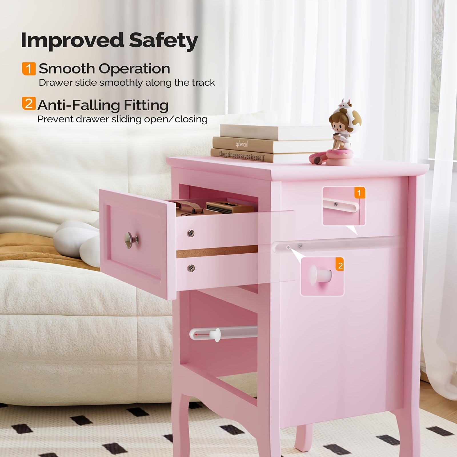 - Compact footprint: height under 27 inches and a slender silhouette that fits beside most beds in small bedrooms, studio apartments, or guest rooms.