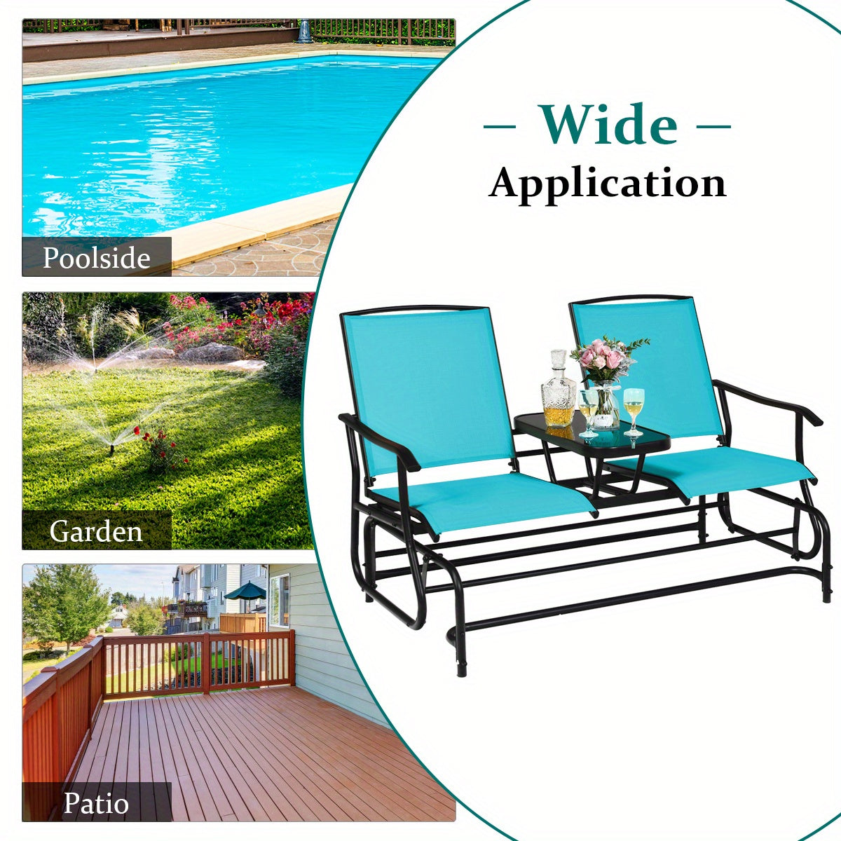 Upgrade your outdoor living with the Costway Two Person Turquoise Glider Rocking Chair Loveseat, a bright, inviting centerpiece that blends relaxation with everyday practicality. This two-seat glider creates a cozy outdoor lounge space where conversation flows as smoothly as the gentle rock, while the tempered-glass center table adds a chic surface for drinks, snacks, or decorative touches.