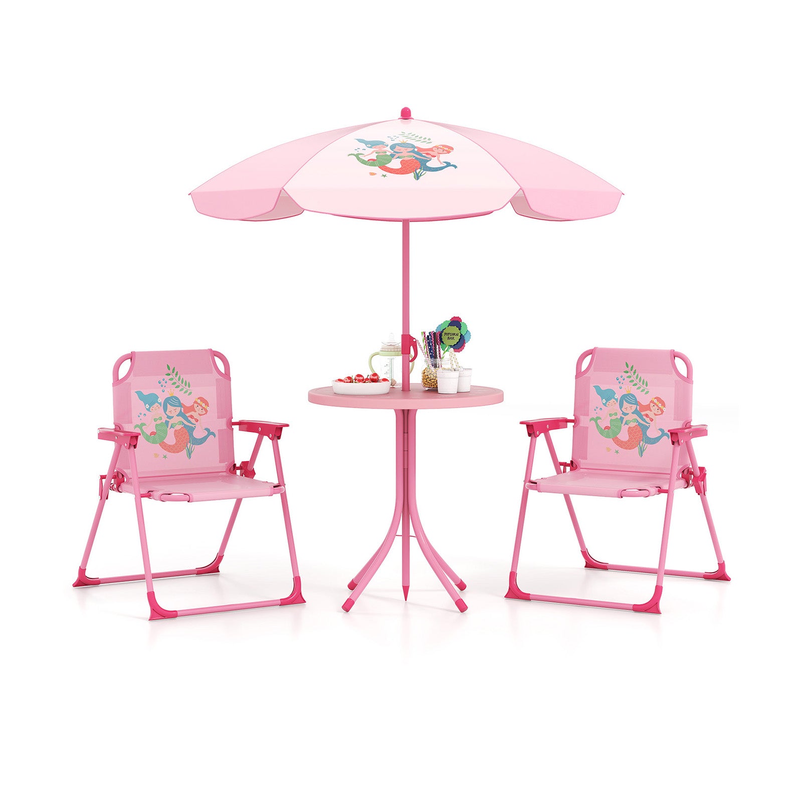 Boost outdoor fun with the Costway Kids Picnic Table & Chairs Set with Umbrella, a complete four-piece ensemble designed for playful picnics, crafts, and sunny days. This pink, kid-friendly set includes a round table with a built-in umbrella hole, two collapsible chairs, and a height-adjustable umbrella for tailored sun protection.