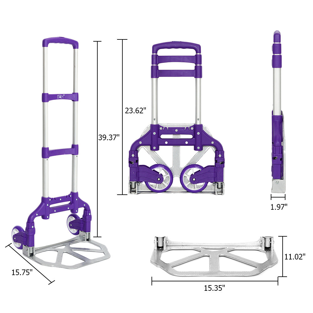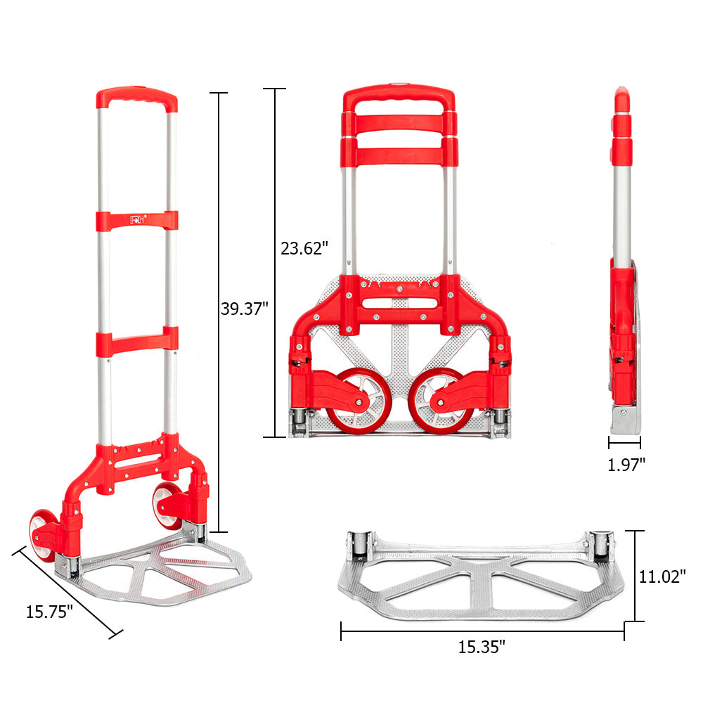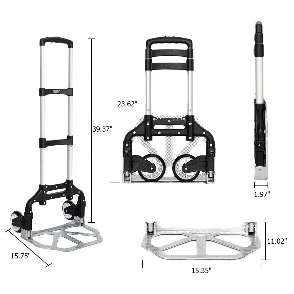 · Compact Folding Size: With unholding dimensions of 39.37" x 15.75"x 15.35",this foldable hand truck can fold down into a very small footprint only 2" thick for easy storage and transportation.