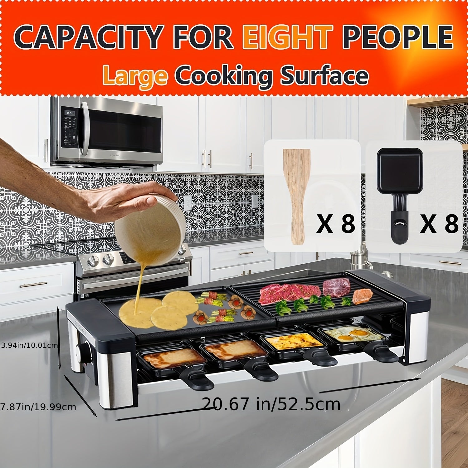 Powered by a robust 1200W heat source and designed for quick, even melting, this raclette setup makes every meal a fun, social experience. The 8 cheese melt pans let you melt cheeses to perfection while you grill a variety of toppings on the main surface.